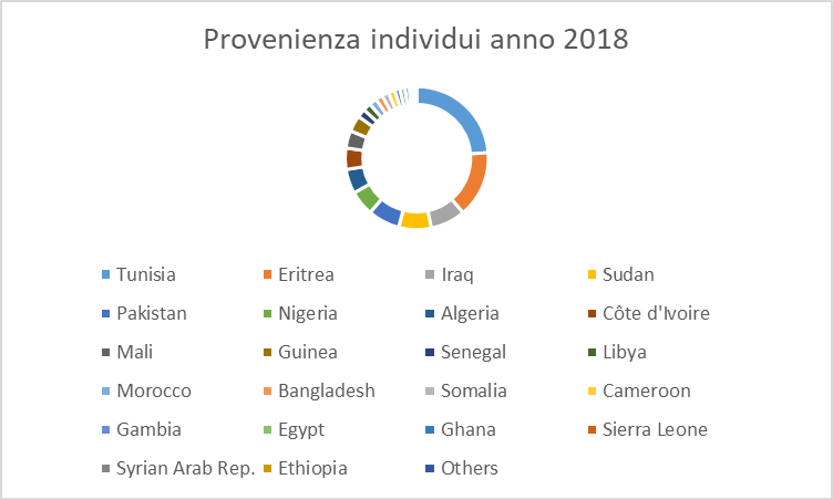 A testimonianza di quanto detto precedentemente, il grafico ci mostra in percentuali approssimate, che, nel Mediterraneo centrale, al 30 gennaio 2018, si sono verificate 185 morti a fronte di 3597 arrivi dalla sola Libia. Un numero che può sembrare piccolo se paragonato a quelli degli anni precedenti, ma che resta comunque importante in quanto si parla di moltitudini di vite che ogni giorno rischiano di non toccare più terra ferma.